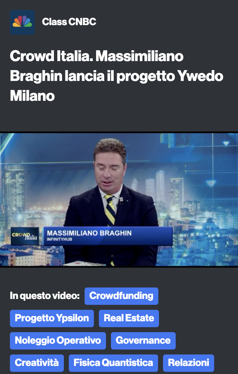 Massimiliano Braghin, presidente di Infinityhub S.p.A. Benefit, su CNBC per presentare il progetto YWedo Milano.